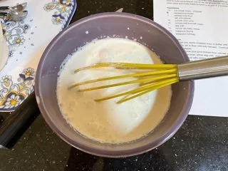 Gradually stir in flour until fully blended. Continue to stir to avoid clumping. Add salt and pepper.